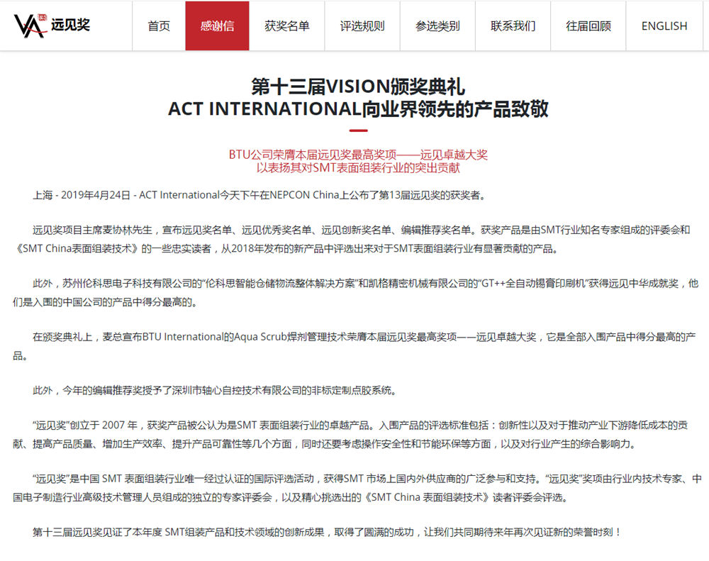 以下內容截圖是來自于第十三屆VISION頒獎典禮官方發布的消息,詳細可點此http://www.smtchinamag.com/visionawards2019/index.html?_t=1556610979官方鏈接進入了解!